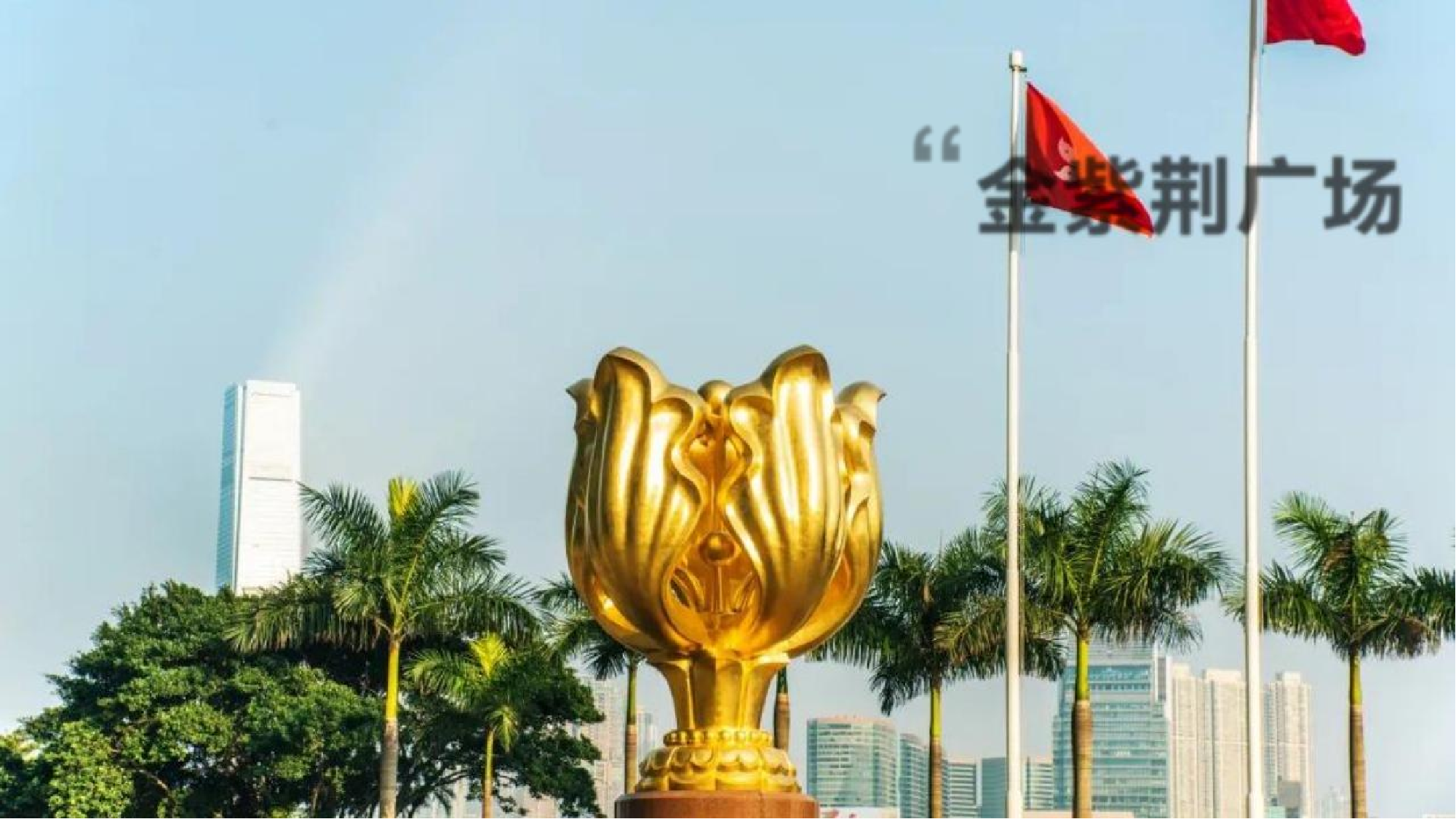 “永远盛开的紫荆花 ”雕塑-金紫荆雕像矗立于香港会议展览中心新翼海旁的博览海滨花园内。 金紫荆广场位于香港会展中心旁,是为纪念香港回归祖国而设立。